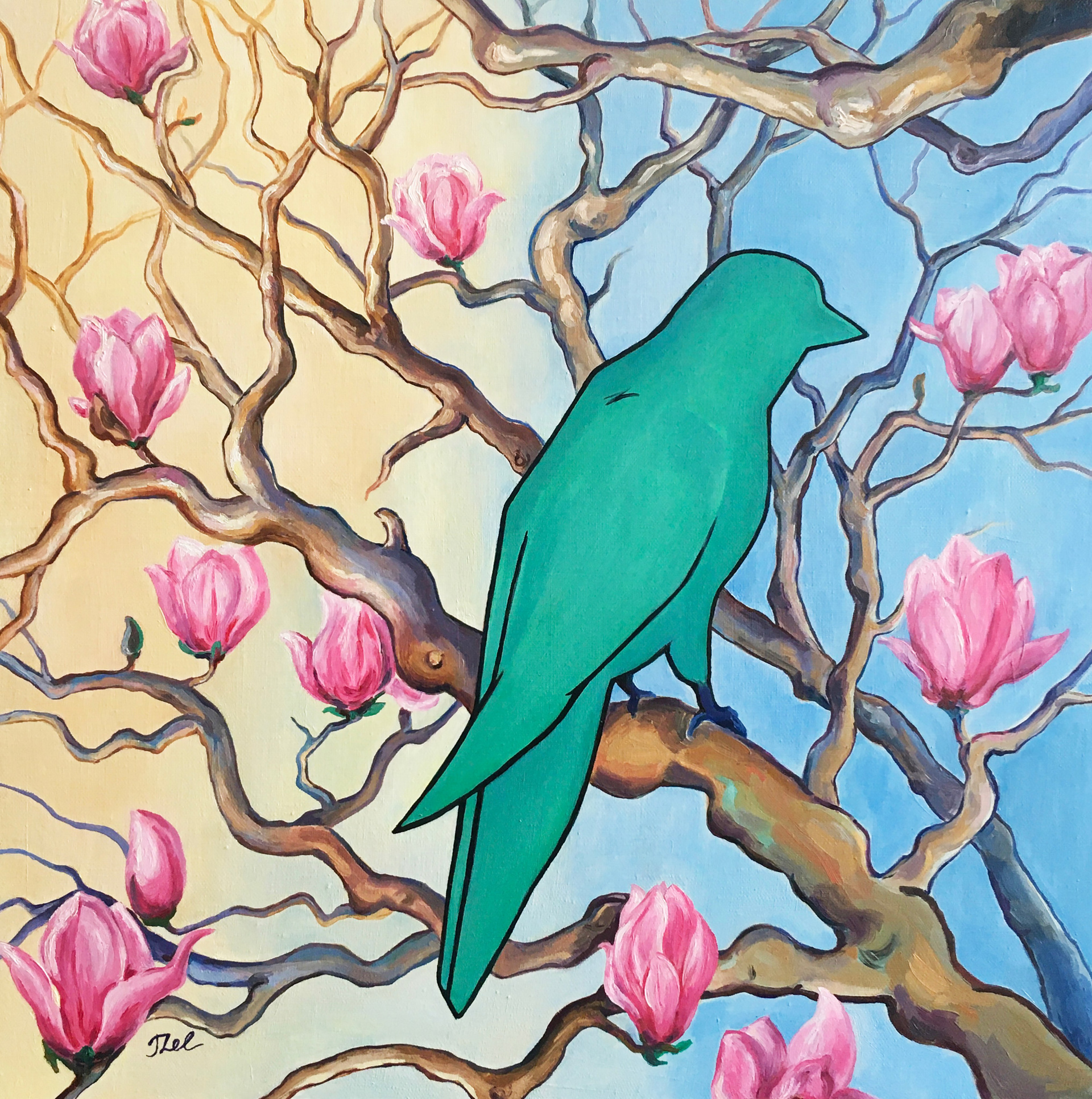 Зелёная птица, сидящая на ветвях цветущего дерева. 50x50 см. Холст, масло