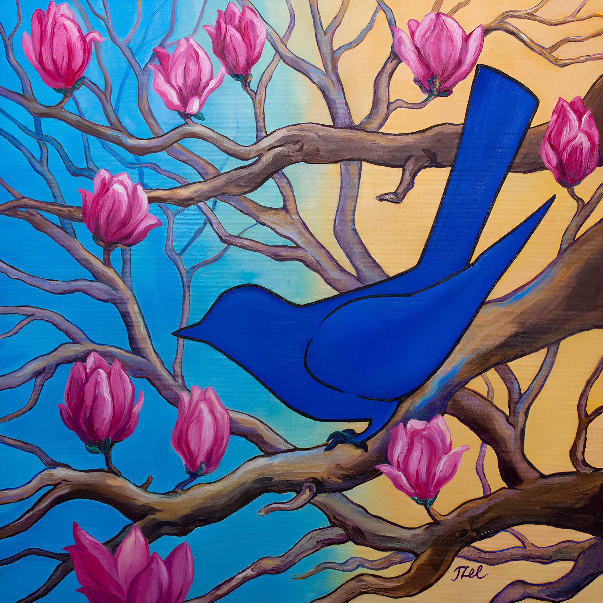 Синяя птица, сидящая на ветвях цветущего дерева. 50x50 см. Холст, масло